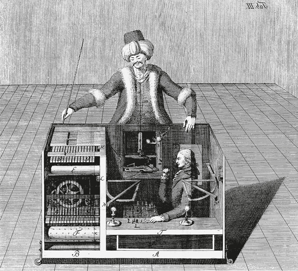 Механический турокВ 1769 году государственный служащий империи Габсбургов по имени Иоганн Вольфганг Риттер фон Кемпелен создал устройство, прозванное механическим турком. Этот подарок должен был произвести впечатление на императрицу Священной Римской империи Марию-Терезию Австрийскую. Почти что волшебная машина фон Кемпелена умела играть в шахматы и побеждать человека – всего лишь с помощью внутренних шестеренок и ремней. Как видно на исторических гравюрах, механический турок представлял собой большой деревянный ящик шириной около четырех футов, глубиной два с половиной фута и высотой три фута[1]; за его дверцами можно было разглядеть сложный внутренний механизм. Сверху располагался человекоподобный автомат: над шахматной доской наклонялась фигура размером с ребенка – халат, тюрбан, впечатляющие усы (этот ориенталистский архетип объединял в глазах европейцев чужака-человека и чужака-машину). Турок протягивал над доской левую руку, брал фигуры и передвигал их. Машина сигналила после сделанного хода, определяла, когда противник жульничает, а лицо автомата могло менять выражение. Механический турок фон Кемпелена настолько всех одурачил, что во время своих путешествий по миру сразился с Бенджамином Франклином в 1783 году и Наполеоном Бонапартом в 1809 году. Оба ему проиграли.