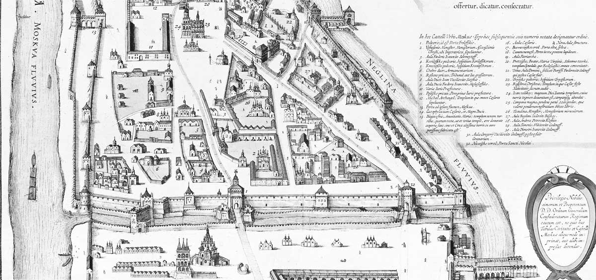 Восточная часть Кремля и Красная площадь на плане «Кремленаград». Около 1600. План ориентирован на запад. Вверху, слева направо: Тайницкие ворота на стороне Москвы-реки, колокольня Ивана Великого, Троицкие ворота и мост с Кутафьей башней на стороне Неглинной. В центре – Чудов и Вознесенский монастыри. Ниже, слева направо: Константино-Еленинские, Спасские и Никольские ворота перед Алевизовым рвом. Внизу – храм Василия Блаженного, Лобное место, церкви на Крови, аркада Верхних Торговых рядов и Воскресенский мост с воротами Китай-города