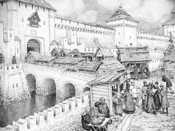 А. М. Васнецов. Книжные лавочки на Спасском мосту в XVII веке. Показаны Алевизов ров и башни по Красной площади до надстроек