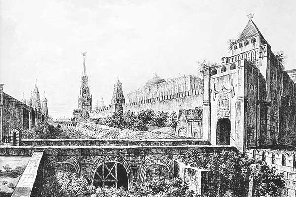 Ф. Я. Алексеев и ученики. Никольские ворота Кремля и Алевизов ров. 1800-е. Ров показан накануне засыпки. Слева – корпус торговых рядов конца XVIII века, просуществовавший еще несколько лет
