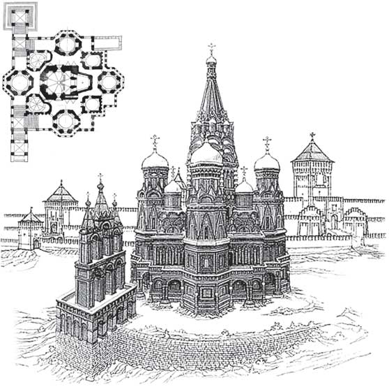 Роскошным оперением стрелы возник Покровский, или Троицкий, собор, что на Торгу, или на Рву, известный более как храм Василия Блаженного.