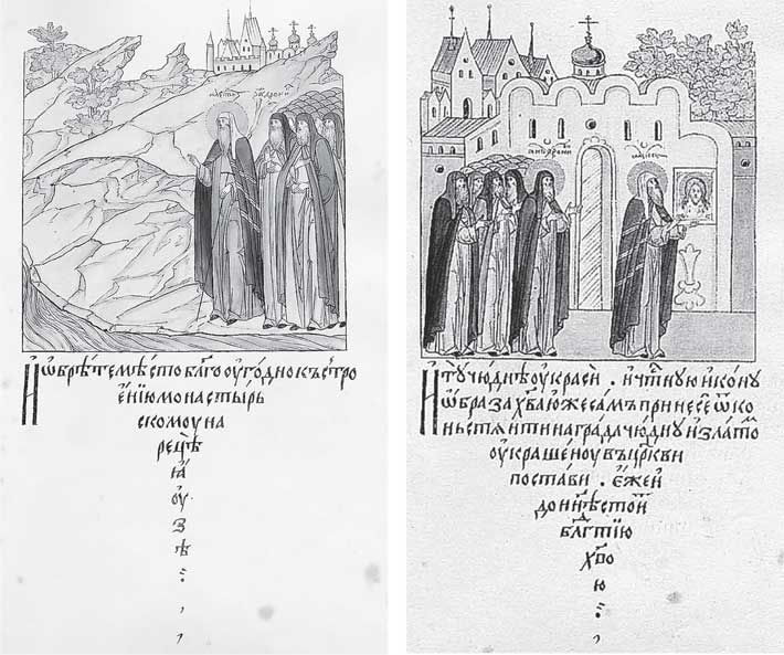 Слева: митрополит Алексий и преподобный Андроник с братией обретают место для монастырского строения на Яузе. Справа: митрополит Алексий вносит Нерукотворный Образ из Константинограда в Андроников монастырь. Миниатюры Лицевого списка жития Сергия Радонежского. Конец XVI века