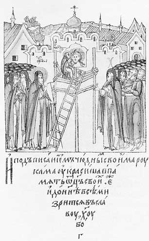 Андрей Рублев пишет Нерукотворный Образ на фасаде Спасского собора. Миниатюра Лицевого списка жития Сергия Радонежского. Конец XVI века