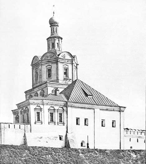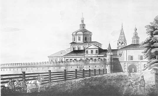 Ф. Кампорези. Вид Андроникова монастыря в Москве. Акварель конца XVIII века. Над Святыми воротами – церковь Рождества Богородицы
