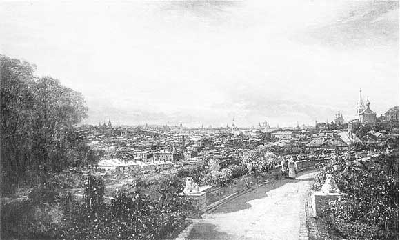 А. П. Боголюбов. Вид Москвы от дома Хлудова (впоследствии Найденовых). На первом плане – пандус, поднимающийся к невидимому главному дому