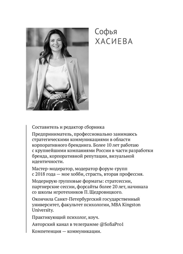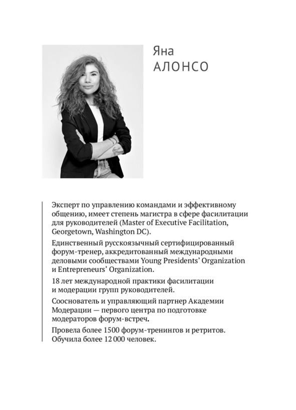 Для меня понятие «модератор» выходит за рамки профессии и приравнивается к воодушевляющей, вдохновляющей позиции «лидер». Если слово «модератор» заменить на «лидер» – книга будет про современное лидерство, использующее мягкие, направляющие инструменты, при этом мощные и трансформирующие. Модератор, как и лидер, должен знать и задавать правила игры, и в то же время быть гибким, готовым к любым поворотам, изменениям, нестандартным задачам. В этом его сила и мудрость.