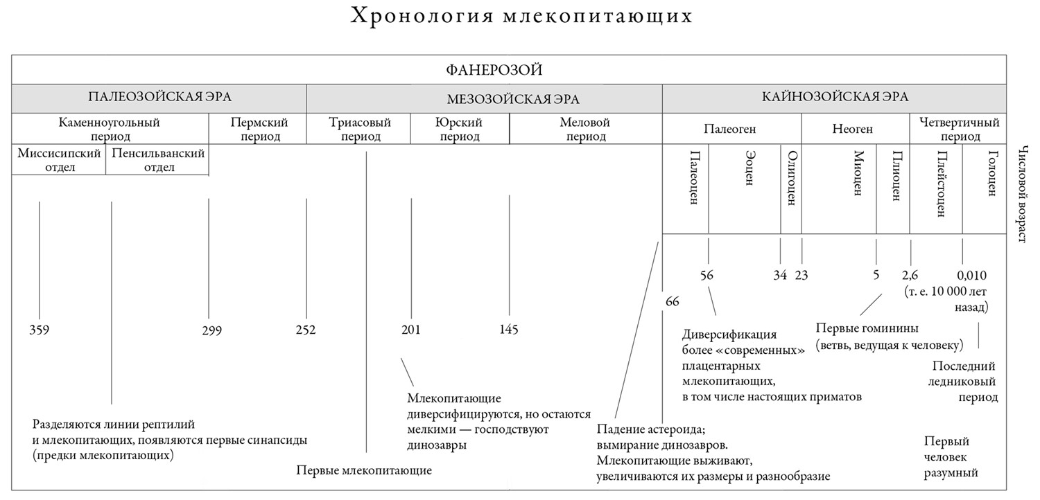 Вымирание динозавров обеспечило этим млекопитающим – в древнем Нью-Мексико и по всему миру – возможность занять лидирующие позиции. Но история млекопитающих началась гораздо раньше. Они – или, вернее, мы – в действительности возникли в то же время, что и динозавры, более 200 млн лет назад, когда вся суша была собрана в единый суперконтинент с пышущими жаром обширными пустынями. У этих первых млекопитающих была еще более древняя родословная, восходящая к влажному царству каменноугольных болот, где около 325 млн лет назад линия млекопитающих отделилась на эволюционном древе от линии рептилий. В течение этих необозримых отрезков времени на геологической шкале у млекопитающих развились их фирменные признаки: шерсть, острые слух и обоняние, крупный мозг и высокий интеллект, быстрый рост и теплокровность, характерный порядок зубов (клыки, резцы, предкоренные, коренные) и, конечно, молочные железы для выкармливания детенышей молоком.