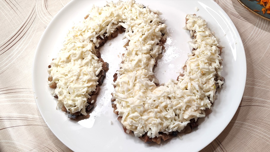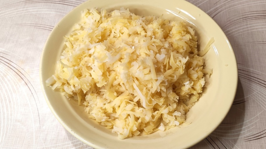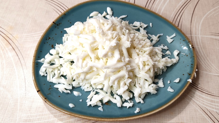 Яичные белки отделяем от желтков и натираем на крупной терке.