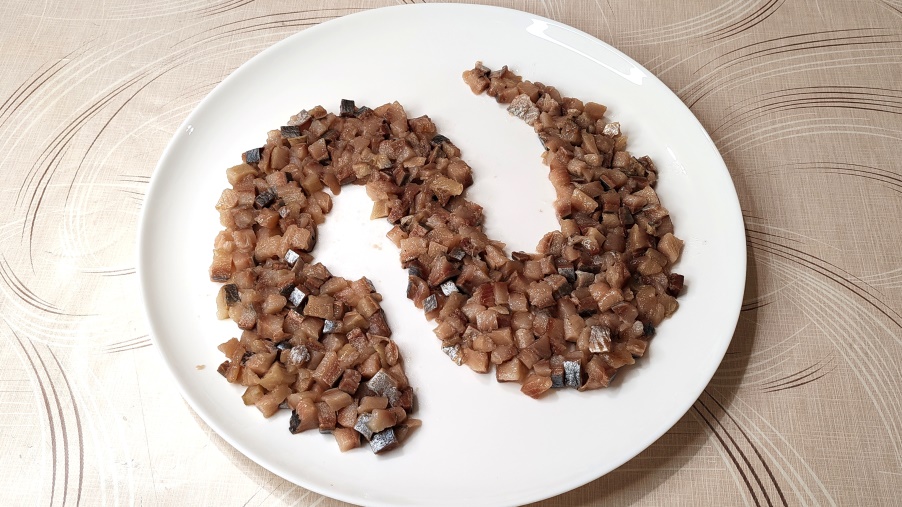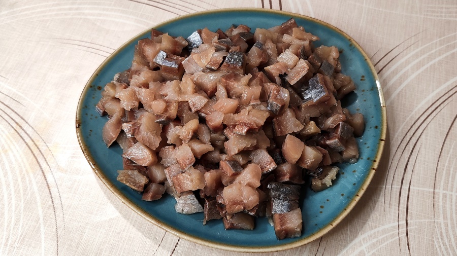 Сельдь разделываем на филе без костей и кожи. Филе сельди нарезаем маленькими кусочками.
