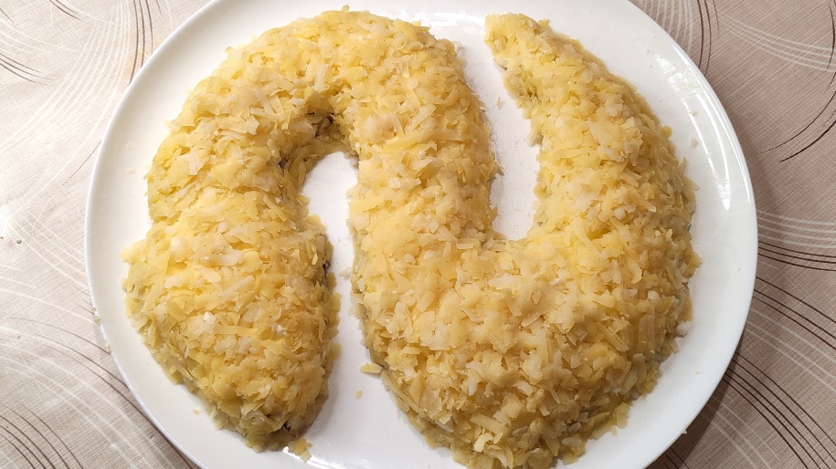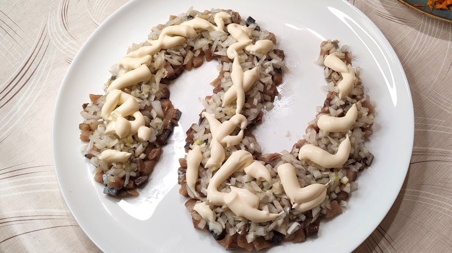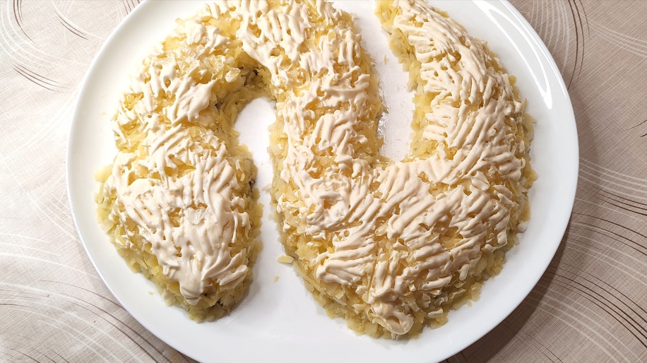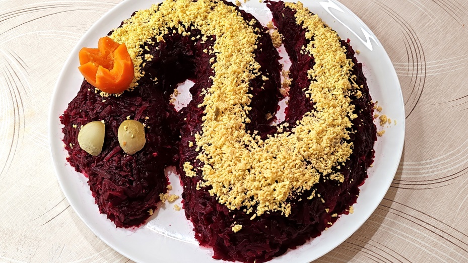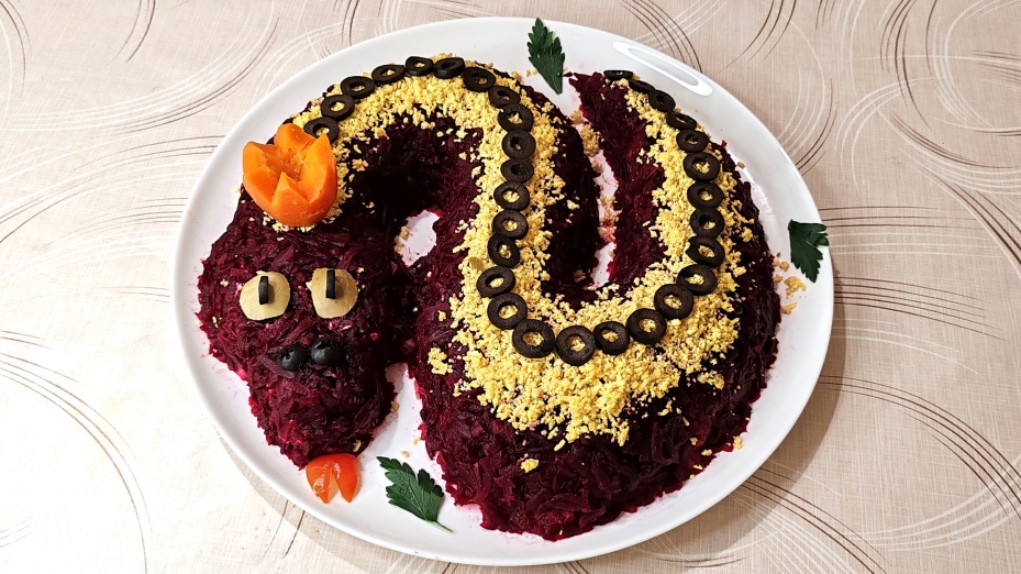 Салат «Селёдка под шубой» в виде змеи готов. Можно подавать на праздничный стол.