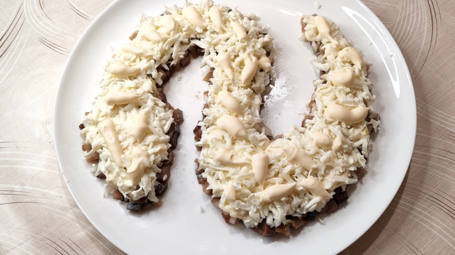 Сверху выкладываем яичные белки. Белки немного присаливаем.