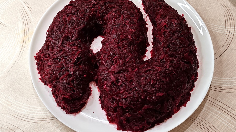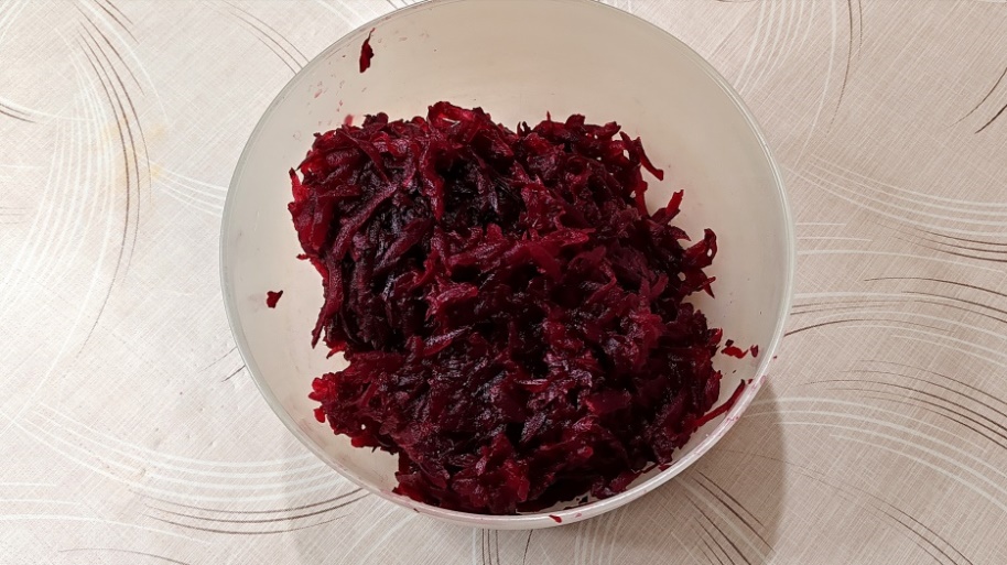 Остывшую свеклу очищаем и натираем на средней терке. После этого тщательно отжимаем из свёклы лишний сок. Это нужно для того, чтобы салат на блюде не потёк.
