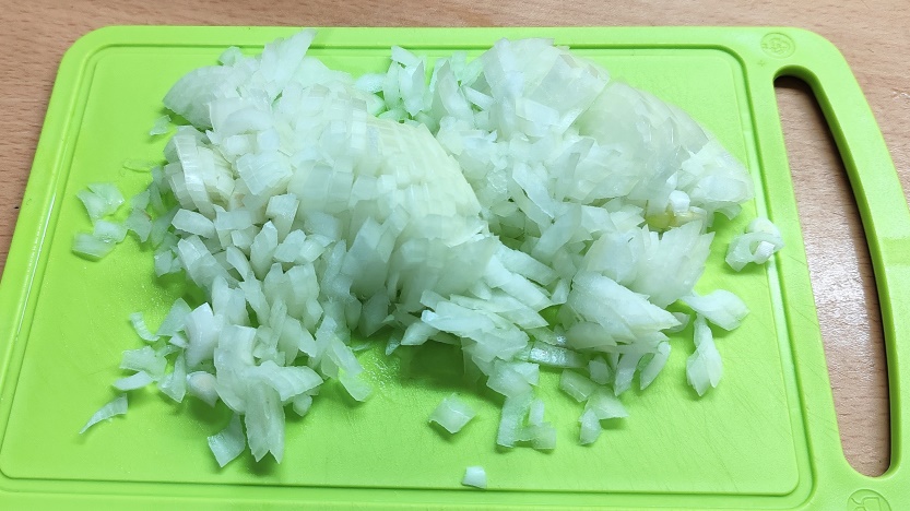 Репчатый лук очищаем и нарезаем маленькими кубиками.