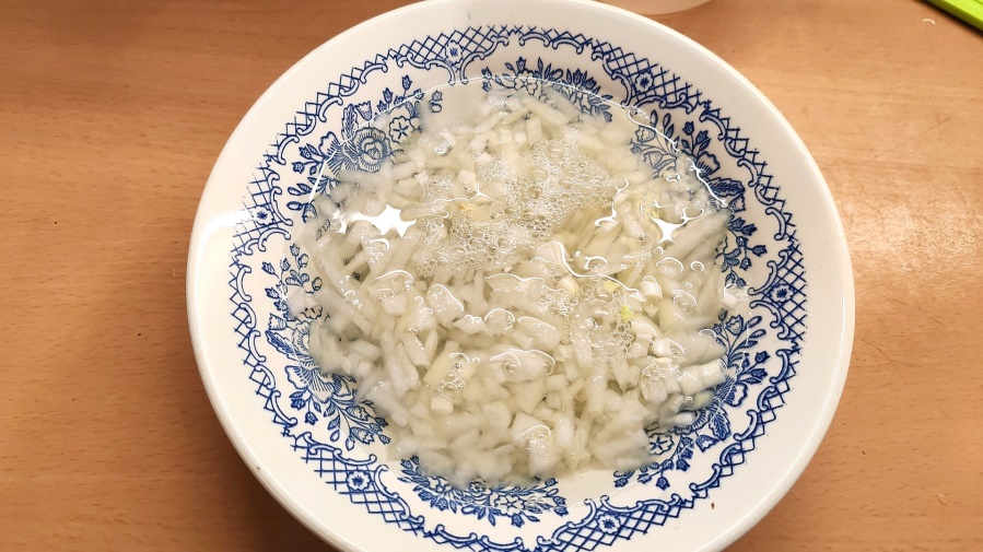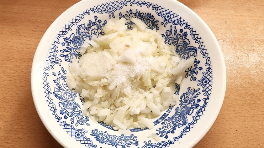 Заливаем лук 200-250 кипятка и помешиваем, чтобы соль и сахар растворились. Оставляем на 20 минут.