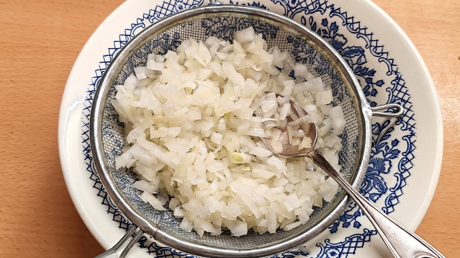 После этого воду сливаем, а лук слегка отжимаем от лишней жидкости.