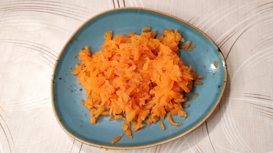 Морковь очищаем, отрезаем кусочек моркови и откладываем его для оформления короны. Остальную морковь натираем на крупной терке.