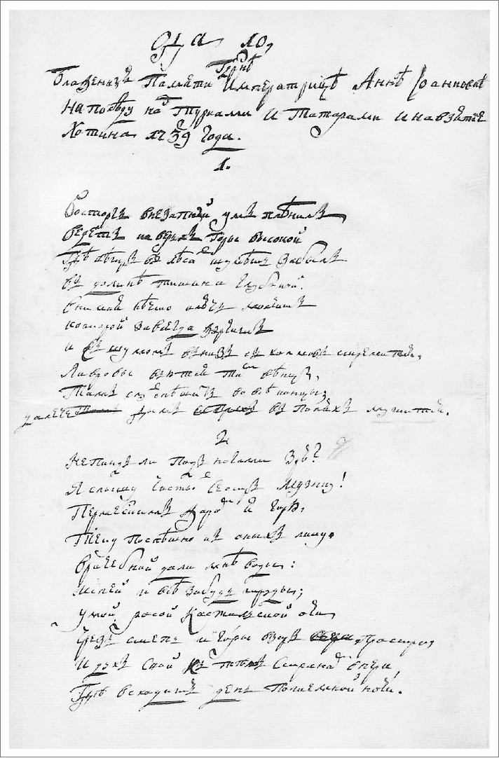 Из памяти изгрызли годы,За что и кто в Хотине пал,Но первый звук Хотинской одыНам первым криком жизни стал.Именно в 1739 году русская поэзия окончательно пошла по тому пути, который привёл её к золотому веку, и продемонстрировала возможность одновременного достижения лирической высоты и глубокой гармонии.