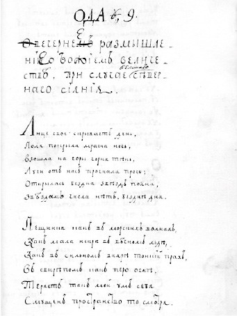 Ломоносов приобрёл книгу Тредиаковского в 1736 году в Петербурге и тогда же испещрил её поля пометами. Два года спустя, в 1738-м, учась в Германии, он переводит оду Фенелона совершенно «правильным», очень легко и естественно звучащим хореем – но с не меньшими, чем у Тредиаковского, языковыми неловкостями. Это работа ученика, который пробует идти дальше учителя, – но всё же ученика. Настоящая революция происходит год спустя.