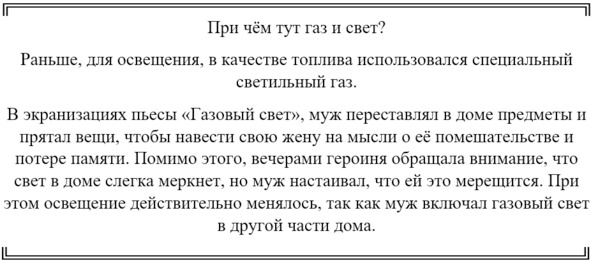 Газла́йтинг (от англ. gas light – газовый свет) – форма психологического давления, направленная на внушение кому-либо чувства вины, заставляющая кого-либо сомневаться в адекватности восприятия действительности.