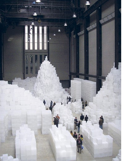 В 2000 году Рэйчел Уайтрид выиграла конкурс на проект Монумента Холокоста в Вене – она создала белый монолитный слепок иудейской библиотеки, в которой можно пересчитать все книги, но ни одну уже нельзя открыть. Хотя монументам подходит хонтологическая эстетика, хонтология – не только про память и скорбь, но и про предчувствия и надежду на утопию. Утопическим мегаполисом с белоснежными пирамидами, напоминающими Вавилон и Египет, небоскребы Нью-Йорка и Чикаго и архитектоны Казимира Малевича, выглядит инсталляция «Набережная» (Embankment), созданная в 2005 году для гигантского Турбинного зала галереи «Тейт Модерн», занимающего здание бывшей электростанции. Весь этот впечатляющий архитектурный ландшафт собран, как из кубиков детского конструктора, из одинаковых белых модулей, каждый из которых является слепком картонной коробки, найденной художницей во время разбора вещей своей скончавшейся матери. У каждого из нас на антресолях или на даче, наверное, есть эта коробка, со старыми фотографиями или письмами, забытыми игрушками или елочными украшениями, пыльная ностальгическая коробка из детства, из кирпичиков которого и состоят утопические образы будущего. Еще одним источником вдохновения для Рэйчел Уайтрид были грузовые контейнеры в портах. «Набережная» – скорее порт, чем променад, предвкушение путешествия, а не туристический вид. В контейнерах еще не распакованными хранятся даже не грузы, а фантастические города, в которые предстоит отправиться. А еще художница сравнивала свою инсталляцию с финальной сценой фильма «Индиана Джонс в поисках утраченного ковчега», – где мы видим гигантский тайный склад, в котором хранятся все сокровища и реликвии мира, считающиеся утраченными.