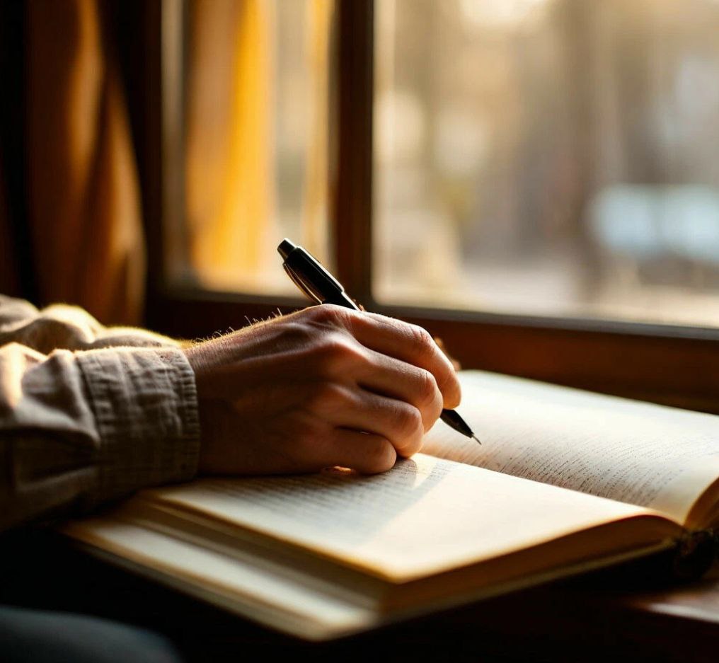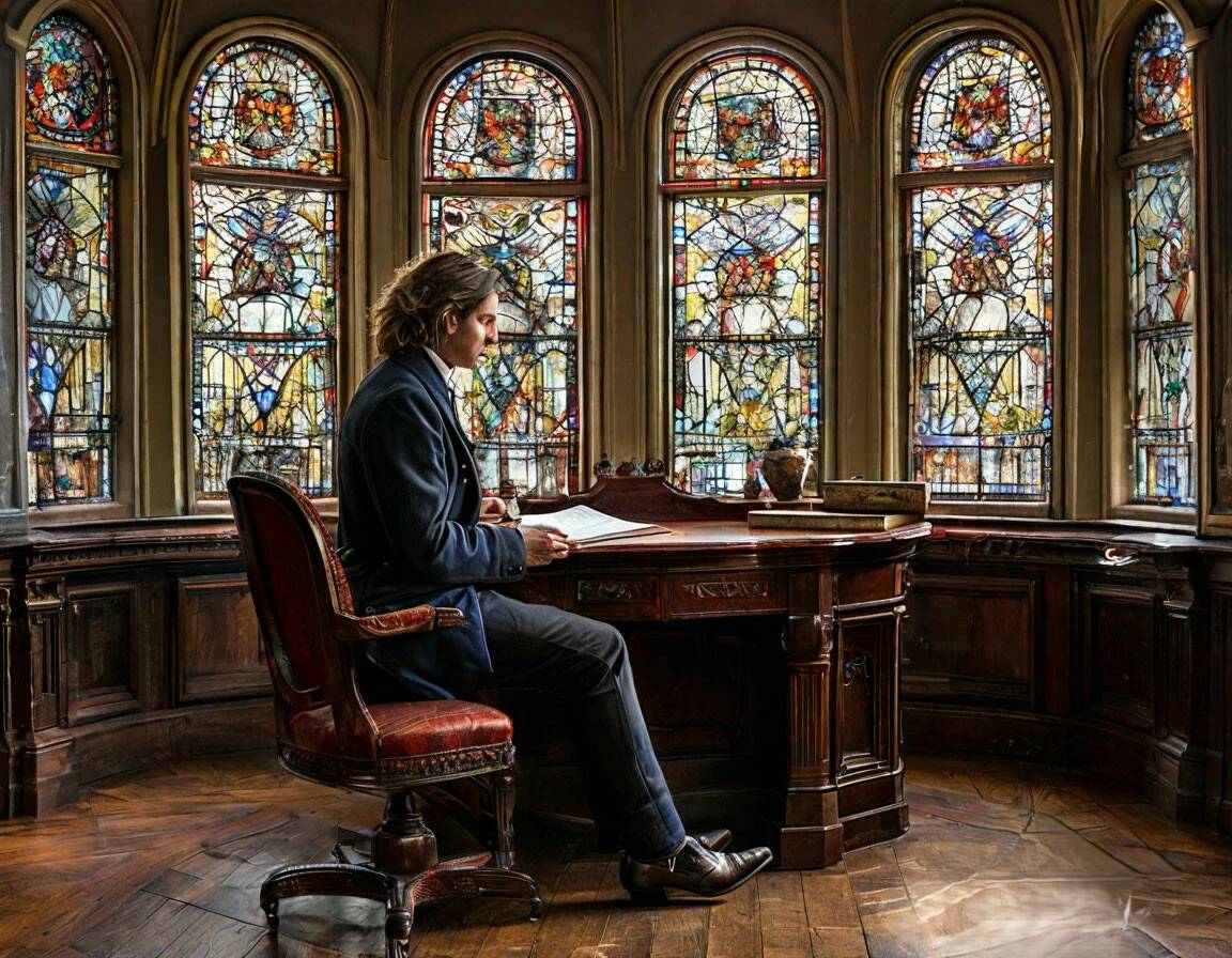 Человек в старинном комзоле сидит в верхней башне невысокого особняка под дневным светом витражных окон и нервно пишет, стуча каблуком по паркету. На страницах старинной тетради появляется запись гусиным пером. Он макает его в чернильницу и совсем не смотрит на текучие кляксы: