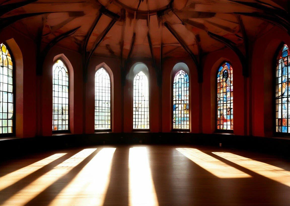 Я распахнул дверь. Выглядело даже уютно. Огромное круглое помещение красного кирпича с высокими цветными витражами вокруг. Потолка не видно. Высоко. Солнце, проникающее в многочисленные окна, создаёт своими лучами причудливые яркие картины на толстом деревянном полу. Пусто.