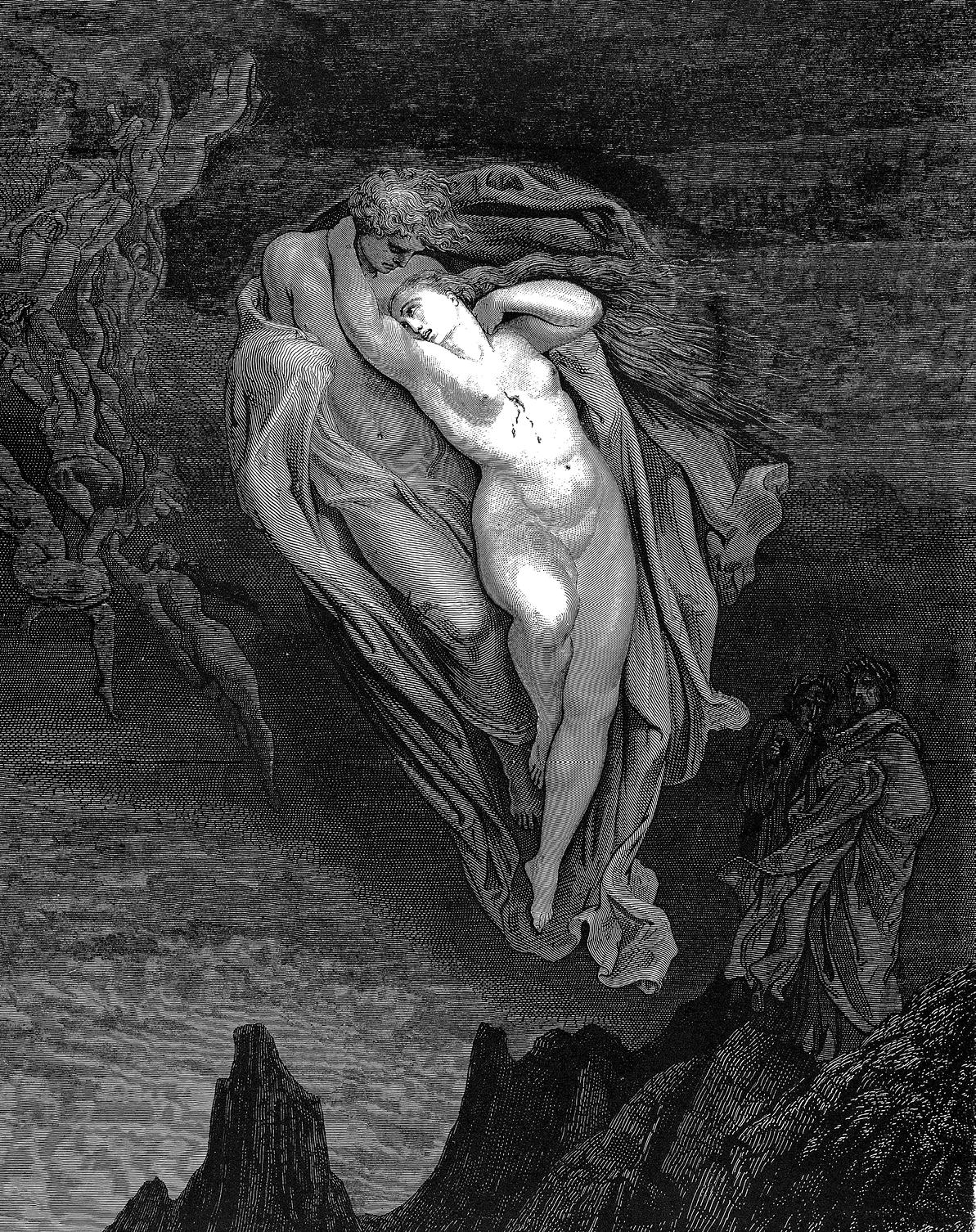 145 И чувство непонятное узнала?»Франческа мне дала такой ответ:«Воспоминания язвят меня, как жало!.. 148 Ужасней и сильнее скорби нет –О днях блаженства вспомнить в дни печали;О том тебе расскажет твой поэт, 151 С тобой идущий. Если о началеМоей любви ты хочешь правду знать,Так слушай же, как мы любовь узнали: 154 Рассказ мой слезы будут дополнять…Однажды Ланчелота 4 приключеньяМы с любопытством начали читать, 157 Где он любви испытывал волненья.Чувств собственных не ведая тогда,Одни мы оставались в те мгновенья. 160 От книги отрываясь иногда,Бледнели мы, и чтенье забывалось;Мы трепетали вместе, но когда 163 Одна страница в книге нам попалась,Решилась вдруг судьба обоих нас:Читали мы, как сладко улыбалась 166 Влюбленная красавица в тот час,Когда любовник пламенный и страстныйПоцеловал в уста ее. Зардясь,