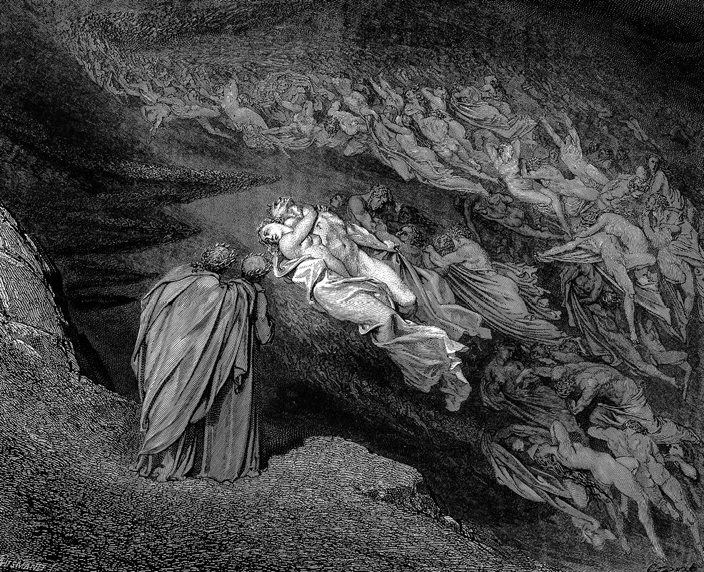 13 На сколько ступеней пониже в АдИм осужденный призрак повергался,И тем хвостом, свернувшимся в обхват, 16 Род казни их всегда определялся.Пред Миносом, покаявшись в грехах,Ряд призраков один другим сменялся 19 И падал в бездну с воплем и в слезах.Меня увидя, Минос суд ужасныйОстановил с проклятьем на губах: 22 «Зачем ты здесь, скажи, пришлец несчастный?Здесь мир скорбей и ужаса приют.Сюда тебе ворота отопрут, 25 Но выйти вон отсюда очень трудно».«К чему грозишь? – сказал мой проводник. –Мы не поймем друг друга обоюдно: 28 Тот, кто своим могуществом велик,Сойти сюда ему дал позволенье.Впусти ж его и удержи язык». 31 И вопли я услышал в отдаленье,Когда вступил в тот мрачный, адский круг,Где раздавались стоны исступленья, 34 Где омертвел, казалось, свет вокруг,Где, словно вечный ропот океана,Носился гул неутихавших мук; 37 Где адские порывы урагана,Бичуя и терзая и кружа,За тенью тень несли среди тумана, 40 И души падших грешников, дрожа,Стеня, хулы на Бога изрыгали.За чувственность казнь эту заслужа, 43 Как я узнал, те души в Ад попали…Как стаи птиц в холодный день зимыВ бессилии мятутся, так летали, 46 Вперед и взад метались в Царстве тьмыСтрадальческие тени. В их страданьеНадежды нет; должны смутиться мы – 49 Лишенные в грядущем упованья,Им отдыха в мучениях не знать.Как в небе журавли в ночном молчанье 52 Начнут, порою, жалобно кричать,Так тени, в общем плаче надрываясь,Неслись в Аду, не в силах устоять 55 В круженье вихря знойного. Теряясь,Про сонм тех душ поэта я спросил,Их адскому круженью ужасаясь. 58 «Вот первая, – Вергилий говорил, –Народов многих гордая царица.Пороком лишь – он ей законом был – 61 Жила сластолюбивая блудница,Открыто поощрявшая разврат.Звалась Семирамидой та срамница. 64 Она была, как хроники гласят,Женою и преемницею Нина,Владея краем, – край тот был богат, 67 Где властвует Судан теперь. КручинаДругую тень смущает: то жена-Самоубийца 1.Горькая судьбина 70 Ее любви печальна и страшна.Вот призрак Клеопатры сладострастной…»Затем Елену видел я: она 73 Являлась на земле звездой несчастной;За нею шли – великий муж Ахилл,Погибший от любви своей напрасной, 76 Парис, Тристан 2… Вергилий повторилИмен людей прославленных немало,Которых пыл их страсти погубил. 79 От состраданья к ним изнемогалаМоя душа, и был я поражен,Когда близ нас собрание предстало 82 Известнейших мужей и славных жен.И я сказал: «Мне хочется, Вергилий,Речь повести с четой теней, как сон, 85 Скользящей и несущейся без крылий».«Пусть ближе налетят они, тогда, –Сказал поэт, – мы можем без усилий 88 Для той беседы вызвать их сюда,Любовью, их связавшей, заклиная».Вот дунул ветр. Как облаков гряда 91 Несется, воли собственной не зная,Приблизились к нам тени. Оживясь,Воскликнул я, к себе их призывая: 94 «О, страждущие тени! Если насБеседой подарить вы в состоянье,Поговорите с нами!» Как подчас, 97 При радостном, веселом воркованьеК родимым гнездам голуби летят,Так при моем невольном восклицанье 100 Чета теней, сквозь общий вихрь и смрад,Толпу тех душ покинув, где стоялаНесчастная Дидона, – тихо, в ряд, 103 Порхнула к нам. Одна из них сказала:«Ты, ради нас сошедший в эту тьму,Ты, чья душа к нам жалость испытала, 106 Хотя преступны все мы, – твоемуВеличию не можем не дивиться,И если бы, в грехах своих, Ему, 109 Творцу миров, мы смели помолиться,Просили б мы, чтоб мир и благодатьНа голову твою могли спуститься 