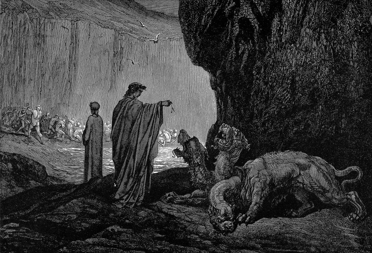 1 Когда опять от тяжкого забвеньяОчнулся я, о муках душ скорбя,Лишившись чувств своих из сожаленья, 4 Я снова увидал вокруг себяРяд призраков и новых мук картины.То был круг третий Ада, где, губя 7 Все встречное, струился дождь на льдины;Проклятый, страшный дождь, и крупный град,И грязный снег слетали на вершины 10 Угрюмых скал. Зловоние и смрад…Там Цербер отвратительно ужасный,С тройною пастью, лаял, дикий взгляд 13 Бросая вкруг, и с жалобой напраснойТонули тени, вспугнутые им.Цвет грозных глаз его – кроваво-красный. 16 Он отличался бешенством своим,Когтями лап и безобразным чревом.Неутомимой злобой одержим,