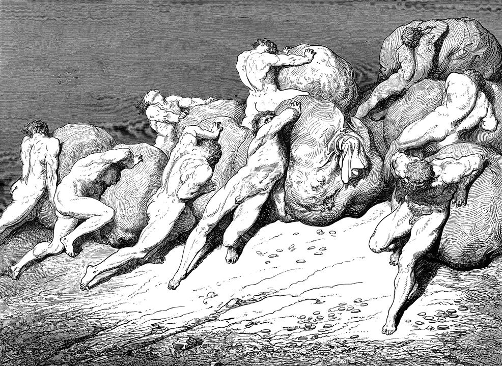 25 Бежать назад, так в вечном исступленьеДолжны сшибаться тени меж собой.Их много здесь, кричащих в озлобленье. 28 Двойной толпой они вступают в бойИ, тяжести огромные бросаяДруг в друга, поднимают дикий вой, 31 С упреками такими отступая:«Что бросил ты?» «А ты что не бросал?»И, двигаясь и вновь в борьбу вступая, 34 Ревут, бегут, как моря грозный шквал,И снова отступают и мятутся,И снова бой… Скорбеть о них я стал, 37 Успела жалость в сердце шевельнуться.«О, кто они? Поведай мне, поэт!Вон там, левей, – иль мог я обмануться?.. 40 Толпа духовных лиц… Сомненья нет:На них я вижу знаки постриженья».«Знай, все они, – мудрец мне дал ответ, – 43 Свой разум довели до ослепленья,И грех их – расточительность. ВзгляниНа их толпу, на шумное движенье: 46 Здесь гранью полукруга все ониОтделены от области другогоГреха. Ты угадал – в иные дни
