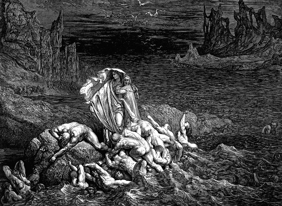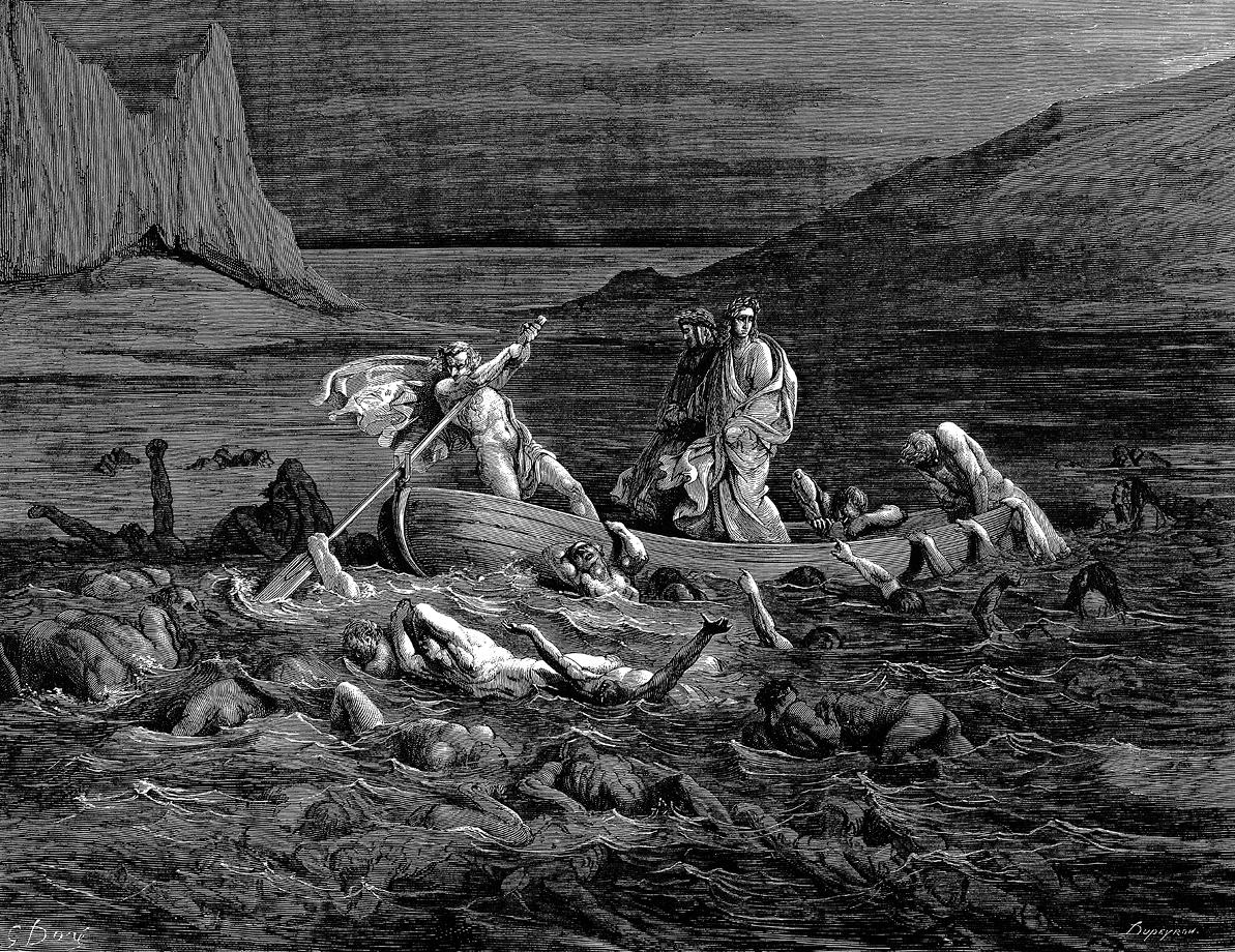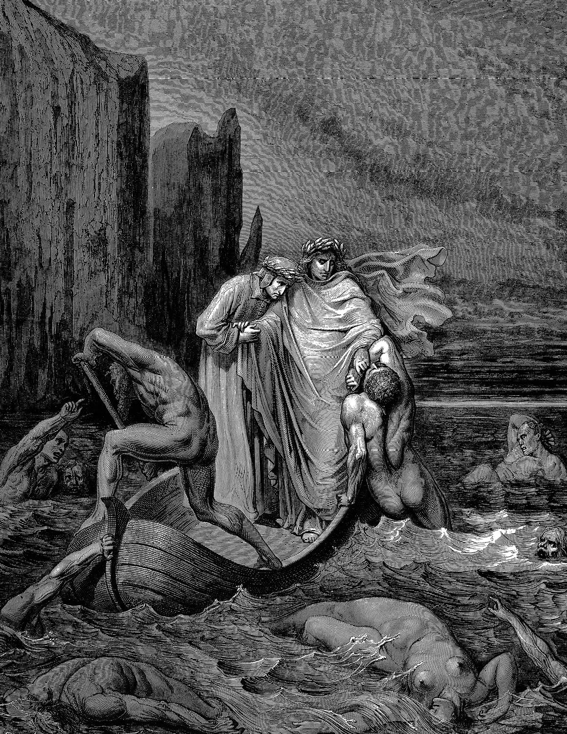 Пятый круг Ада. Флегиас перевозит чрез болото Стикса Вергилия и Данте. Отвратительные мучения Филиппа Ардженти. Путники приближаются к адскому укреплению Дитэ, где адская стража демонов преграждает им вход в проклятый город.