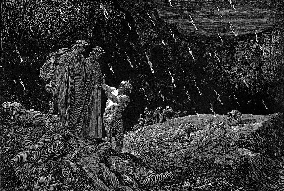 Данте и Вергилий вступают на грань второго отдела седьмого круга Ада. Степь и огненный дождь. Преступники против Бога, природы и искусства. Бешенство Капанея и его наказание. Таинственный исток трех адских рек.