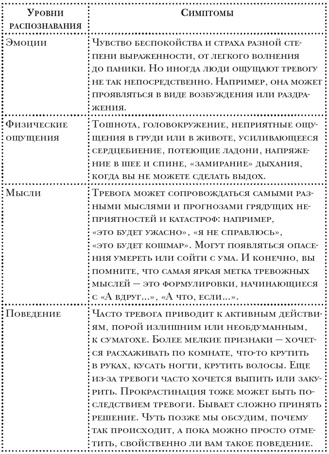 Чтобы вам было проще понимать свое состояние, можно ориентироваться на маркеры тревоги. Далее я привожу список возможных симптомов, которые подскажут, что прямо сейчас вы охвачены тревогой. Какие-то из этих симптомов покажутся вам знакомыми, а про другие вы скажете, что они к вам не относятся. Это нормально, ведь все мы разные. Просто обратите внимание на те симптомы, которые вы у себя наблюдали.