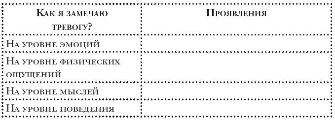 Начнем с того, что составим для вашего внутреннего наблюдателя небольшую шпаргалку, которая поможет ему заметить, что вы начали волноваться и беспокоиться. Воспользуйтесь предыдущей таблицей, чтобы найти и выписать оттуда свои симптомы, или вспомните, какие проявления тревоги вам свойственны.