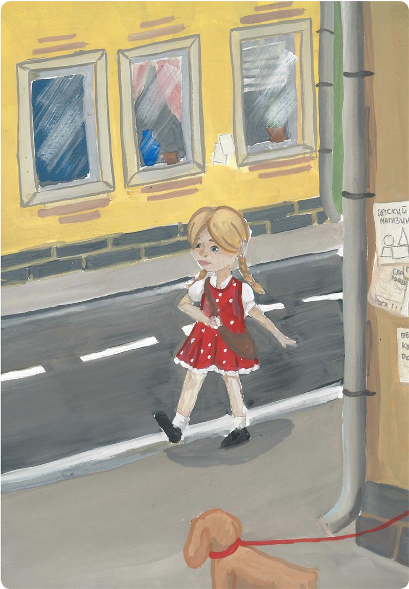 В платье модного фасонаШла по улице Алёна.Две косички по плечам,Смотрит вдаль по сторонам,В сумке кожаный мешокЗаменяет кошелёк.Денег было хоть и мало,На пирог вполне хватало.     В это утро очень рано  В магазин послала мама,Так сказав: «За переулком  Магазин торгует булкой.   Пекарь только что испёкВкусный нам с тобой пирог.        Прямо до конца иди,         Никуда не заходи!»Но Алёна точно знала:Времени на то немало.      Нога за ногу идёт  Да под нос себе поёт.  Наслаждается прогулкой    И размахивает сумкой.Вдруг навстречу ей собака,           Белоухая зевака,   Гонит стаю голубей.Те взлетают поскорей,  И задорная проныра  Бегает без перерыва.