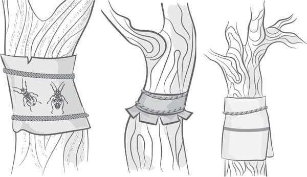 Самый простой ловчий пояс можно сделать, обернув ствол скотчем клейкой стороной наружу. Можно обернуть ствол тканью, пропитанной клеем. Можно прикрепить к стволу полиэтилен таким образом, чтобы он образовал такую своеобразную юбочку, которая будет служить ловушкой для взбирающихся по стволу насекомых. Или купить специальные ловчие пояса в магазине.