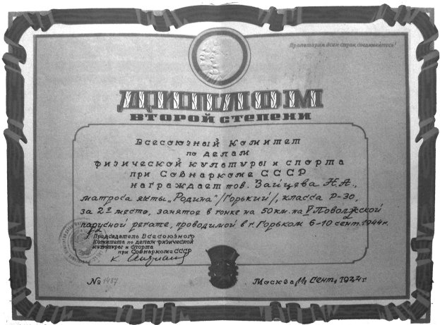 Я поступила в Индустриальный на кораблестроительный факультет. Будучи студенткой первого курса, узнала, что в институте есть кружок любителей паруса, руководимый Ростиславом Алексеевым. Он учился на четыре года старше. Я пришла туда и стала заниматься. Почти каждый день ходила на водную станцию спортивного общества «Водник», которая располагалась около Канавинского моста. Стала яхтсменкой. Там-то я и познакомилась с Колей Зайцевым.