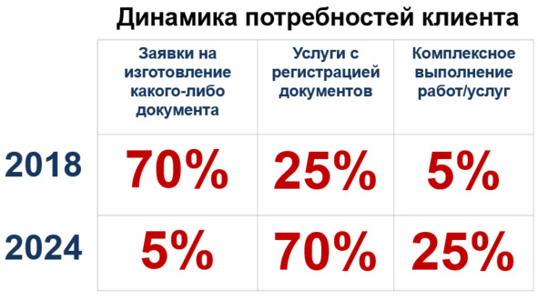 Сейчас на рынке происходит трансформация конечного продукта. Конечный продукт, на мой взгляд, остался тем же – достижение результата, например, постановка жилого дома на кадастровый учет. Однако, в отличие от 2016—2018 гг., когда потребитель самостоятельно выполнял большинство действий, кроме изготовления технического плана, сейчас конечный продукт выглядит так же, но потребитель выбирает подрядчика, который готов закрыть все задачи и предоставить готовый конечный результат, тем самым переложив весь комплекс работ и услуг по созданию конечного продукта на исполнителя или подрядчика.
