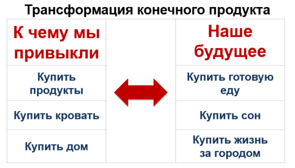 Следовательно, в будущем нас ждет тенденция к максимально коротким и удобным путям получения конечного продукта. Например, в случае с нашим питанием это уже заметно: раньше большинство людей покупали продукты и готовили дома. Однако в последнее время многие предпочитают ходить в рестораны или заказывать готовую еду.