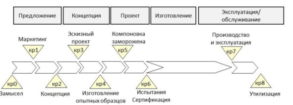 Перечислим основные фазы ЖЦ продукта и типовые контрольные рубежи (КР), или ворота принятия решений, на различных этапах модельного ЖЦ программы создания изделия, показанные на рис. 2.