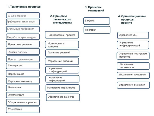 В стандарте «Процессы жизненного цикла систем» ISO 15288:2015 (ГОСТ Р 57193—2016) сегодня перечислены 30 базовых процессов жизненного цикла систем (рис. 3). Эти процессы разделены на четыре основные группы.