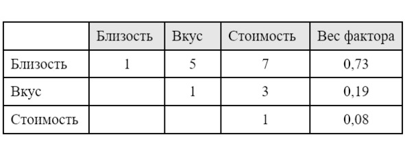 Можно видеть, что в результате критериального выбора наивысший весовой коэффициент получило кафе, расположенное ближе других. Тогда как факторы качества пищи и ее стоимости оценены существенно ниже.