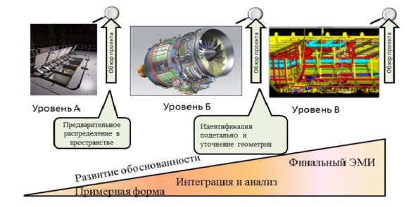 Электронный макет соответствует текущему этапу жизненного цикла продукта и в авиастроении включает обычно три уровня проработки (рис. 12).