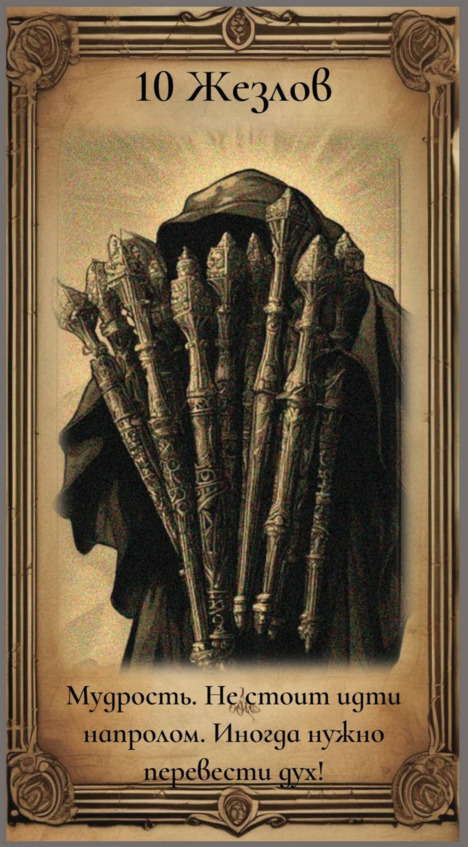 Достаньте для проживания карту «Десятка Жезлов» в ситуациях, когда вам не хватает выдержки и сил, чтобы доделать задачи и завершить начатое.