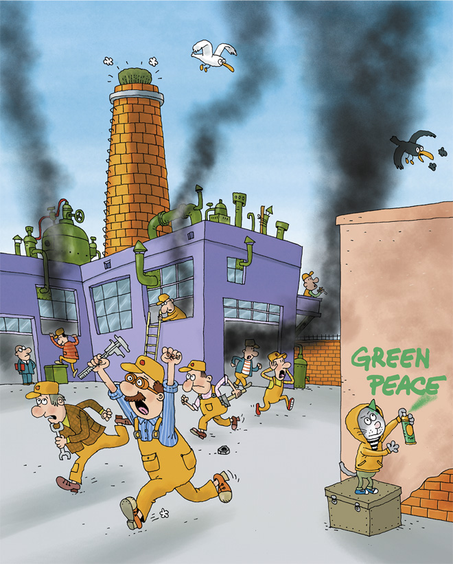 Котя рассказал, что он и другие «зелёные» спасают природу, защищают её от фабрик, которые сливают отходы в реки и моря, загрязняют воздух вредными выбросами.