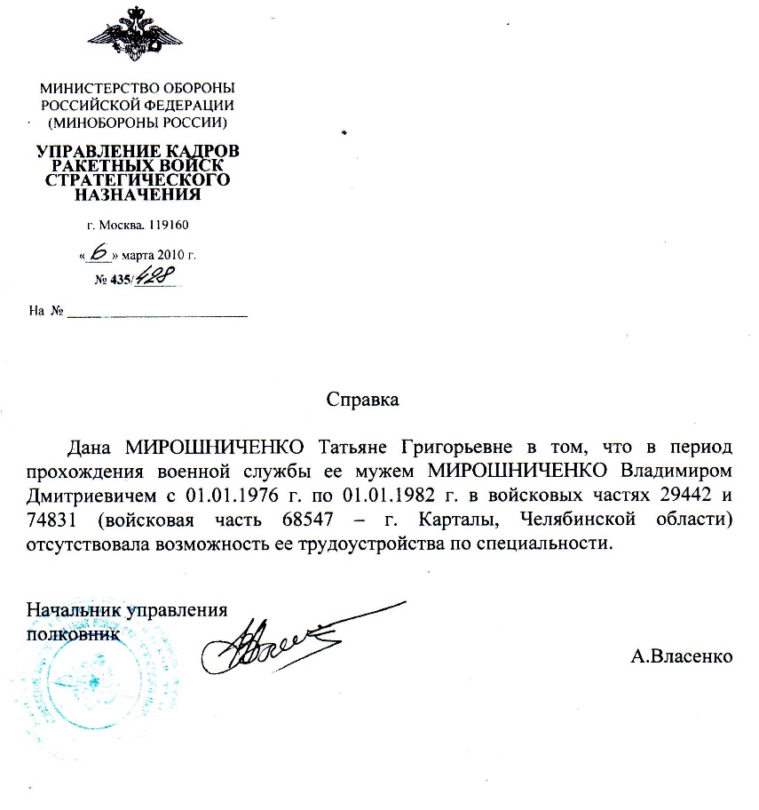 Перебирая свои личные архивные документы, я нашёл одну из таких справок, выданную супруге В.Д. Мирошниченко – Татьяне Григорьевне, от 6 марта 2010 года, подписанную начальником Управления кадров РВСН полковником А. Власенко. Я рад, что смог помочь через генерал-лейтенанта А.А. Швайченко своим однокурсникам в те годы!