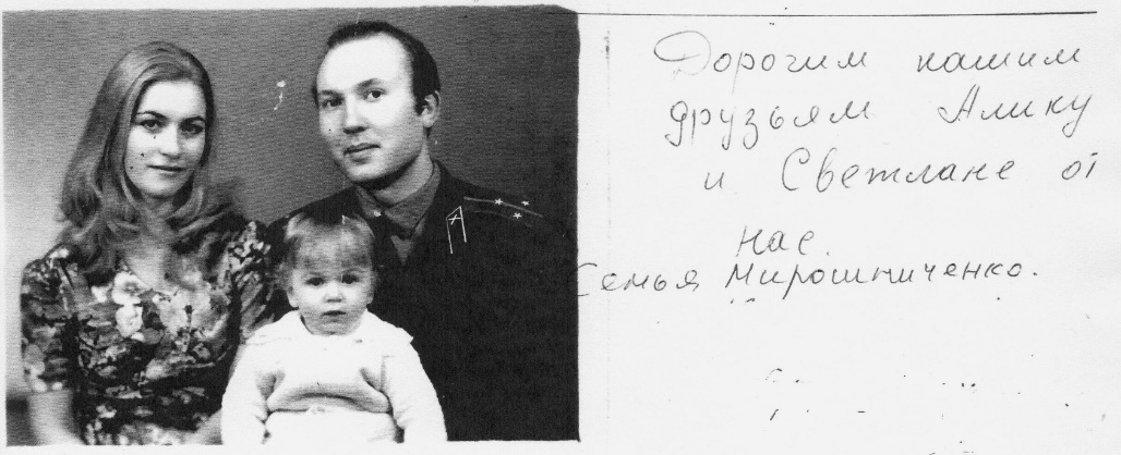 Работая над написанием этого очерка, перебирая свои архивные фотографии и документы, я нашёл прекрасную фотографию семьи Мирошниченко, на которой рукой Татьяны сделана надпись: «Дорогим нашим друзьям Алику и Светлане, от нас. Семья Мирошниченко».