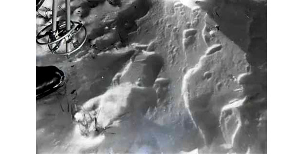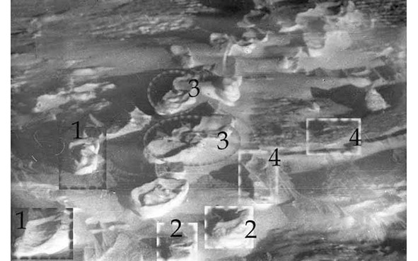 Один из немногих фотоснимков, запечатлевших следы отхода группы Дятлова по склону. Следствие не осуществило надлежащих мероприятий по фиксированию и анализу следовых дорожек, которые в конце февраля-начале марта 1959 г. всё ещё имели неплохую сохранность. Неплохую до такой степени, что со слов поисковиков, видевших следы своими глазами, по отпечаткам можно было понять обутой или разутой ногой они были оставлены. Изучение отпечатков ног на всём их протяжении (примерно полукилометра) позволило бы судить как о персональной принадлежности следов, так и важных особенностях движения группы. На представленном фотоснимке можно с высокой степенью достоверности вычленить отпечатки мужских ног (поз.1) с небольшой длиной шага, маленькие по размеру отпечатка следы девушки (поз.2) и наложенные друг на друга следы по крайней мере двух мужчин, шедших один за другим (поз.3). Кроме того, присутствуют и следы ещё одного мужчины (поз.4), шаг которого заметно шире шагов прочих членов группы, а следовая дорожка совпадает с таковой девушки (напрашивается предположение о том, что мужчина прикрывал отход группы, а потом догонял ушедших вперёд. Важно помнить, что следы вели под гору, а широко шагать сверху вниз весьма неудобно). Если бы в следственном деле имелись правильно сделанные (с криминалистической точки зрения) фотоснимки следовых дорожек, то сейчас бы исследователи могли очень точно воспроизвести поведение членов группы в первые минуты с момента начала развития чрезвычайной ситуации. К сожалению, об этом приходится говорить лишь в сослагательном наклонении.