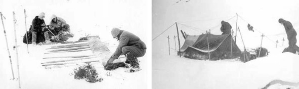 Эти фотоснимки не имеют прямого отношения к походу группы Игоря Дятлова зимой 1959 г. Левый фотоснимок: установка палатки «на лыжи» (это был популярный среди туристов 50-60-х гг. «фирменный» способ установки палатки на снег). Фотоснимок справа: та самая 4-метровая палатка «дятловцев» в походе 1958 г. Снимок интересен тем, что позволяет наглядно увидеть систему растяжек, используемую при установке палатки.