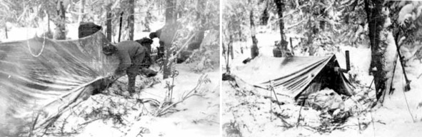 Палатка «дятловцев» в последнем походе. Фотографии из фотоаппаратов погибших туристов, снимки сделаны в последних числах января 1959 г. в долине реки Ауспия. На левом фотоснимке выделена петля, вшитая в конёк крыши палатки, в которую заведена верёвка-растяжка. Растяжка крепилась либо к веткам деревьев, если таковые имелись поблизости, либо пропускалась через лыжу и привязывалась к лыжной палке, заменявшей собою колышек. На фотографии справа можно хорошо видеть дымоход самодельной печки Игоря Дятлова, выведенный наружу через противоположный входу торец палатки.